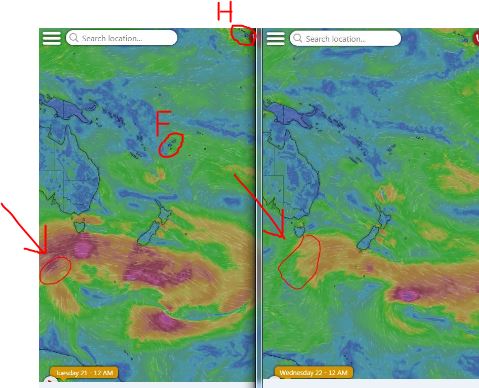 This swell was created by the fetch in the collage below of the maps of Dec 21 and 22 on which I also put an F and an H to indicate the positions of Fiji and Hawaii. Is it going to make it all the way to us? Technically yes, but it ain't gonna look like that... 1.5ft 15s predicted by Surfline on Wednesday.
